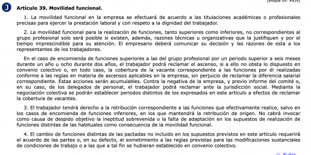 El Estatuto de los Trabajadores también recoge un caso muy habitual en el día a día de las empresas, cuando los jefes deciden cambiar de puesto a un trabajador dentro del organigrama. A esto hace referencia el artículo 39 del Estatuto de los Trabajadores, que se denomina «movilidad funcional». «La movilidad funcional en la empresa se efectuará de acuerdo a las titulaciones académicas o profesionales precisas para ejercer la prestación laboral y con respeto a la dignidad del trabajador», dice el punto número 1 de este artículo 39.