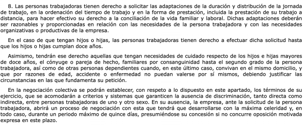 El artículo 34.8 del Estatuto de los Trabajadores, en su punto número 8, deja claro que «las personas trabajadoras tienen derecho a solicitar las adaptaciones de la duración y distribución de la jornada de trabajo, en la ordenación del tiempo de trabajo y en la forma de prestación, incluida la prestación de su trabajo a distancia, para hacer efectivo su derecho a la conciliación de la vida familiar y laboral».