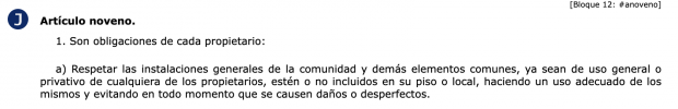 El artículo noveno de la Ley de Propiedad Horizontal es el que hace mención al respeto de las zonas comunes dentro de un edificio. La ley, en su punto número 1, deja claro que son obligaciones de cada propietario: «Respetar las instalaciones generales de la comunidad y demás elementos comunes, ya sean de uso general o privativo de cualquiera de los propietarios, estén o no incluidos en su piso o local, haciendo un uso adecuado de los mismos y evitando en todo momento que se causen daños o desperfectos».