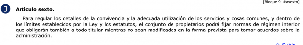 En el artículo sexto, la Ley de Propiedad Horizontal habla de las normas de régimen interior que los vecinos podrán fijar en los estatutos y que podrían establecer las sanciones para los vecinos que no respeten las zonas comunes. «Para regular los detalles de la convivencia y la adecuada utilización de los servicios y cosas comunes, y dentro de los límites establecidos por la ley y los estatutos, el conjunto de propietarios podrá fijar normas de régimen interior que obligarán también a todo titular mientras no sean modificadas en la forma prevista para tomar acuerdos sobre la administración», informa la LPH.