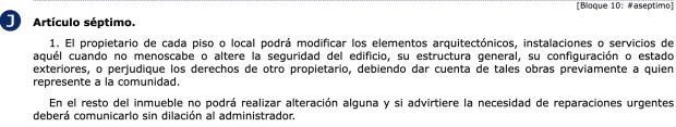 La Ley 49/1960, de 21 de julio, sobre propiedad horizontal, en su artículo 7.1 deja claro lo siguiente: «El propietario de cada piso o local podrá modificar los elementos arquitectónicos, instalaciones o servicios de aquel cuando no menoscabe o altere la seguridad del edificio, su estructura general, su configuración o estado exteriores, o perjudique los derechos de otro propietario, debiendo dar cuenta de tales obras previamente a quien represente a la comunidad».