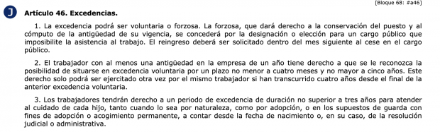«El trabajador con al menos una antigüedad en la empresa de un año tiene derecho a que se le reconozca la posibilidad de situarse en excedencia voluntaria por un plazo no menor a cuatro meses y no mayor a cinco años. Este derecho solo podrá ser ejercitado otra vez por el mismo trabajador si han transcurrido cuatro años desde el final de la anterior excedencia voluntaria», dice el artículo 46 del Estatuto de los Trabajadores. También tendrán derecho a un periodo de excedencia de no más de tres años los padres o madres para atender al cuidado de un hijo.