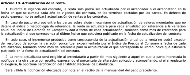 «Durante la vigencia del contrato, la renta solo podrá ser actualizada por el arrendador o el arrendatario en la fecha en que se cumpla cada año de vigencia del contrato, en los términos pactados por las partes. En defecto de pacto expreso, no se aplicará actualización de rentas a los contratos», informa el punto número 1 de este artículo de la Ley de Arrendamientos Urbanos.