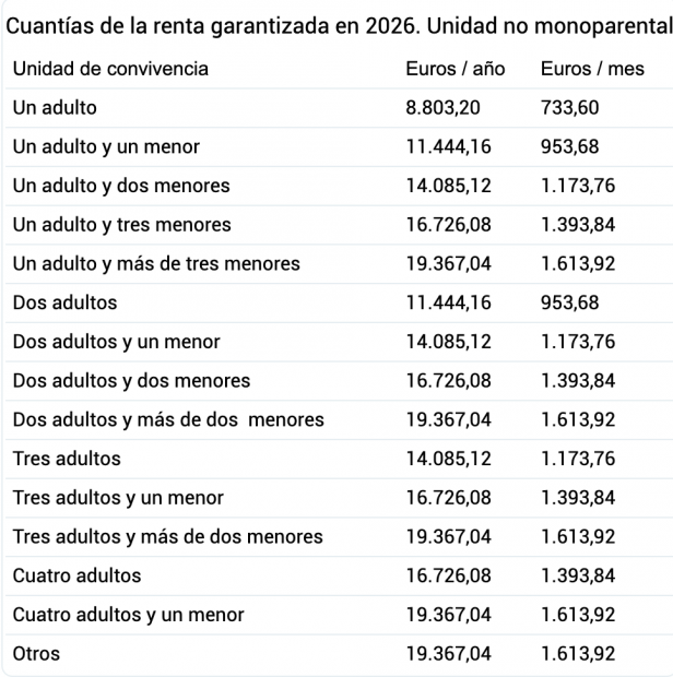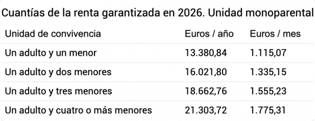 Estas cantidades aumentarán en caso de que la unidad sea monoparental, que esté formada por una sola persona. En caso de tener a un menor a cargo, la cuantía para 2026 será de 1.115,07 euros al mes; si hay dos menores, pasará a ser de 1.335,15 euros y, en caso de que la unidad de convivencia la formen un adulto y tres menores, la renta garantizada será de 1.555,23 euros. Si una persona tiene cuatro o más menores a cargo, será de 1.775,31 euros, que equivale a 21.303,72 euros al año.