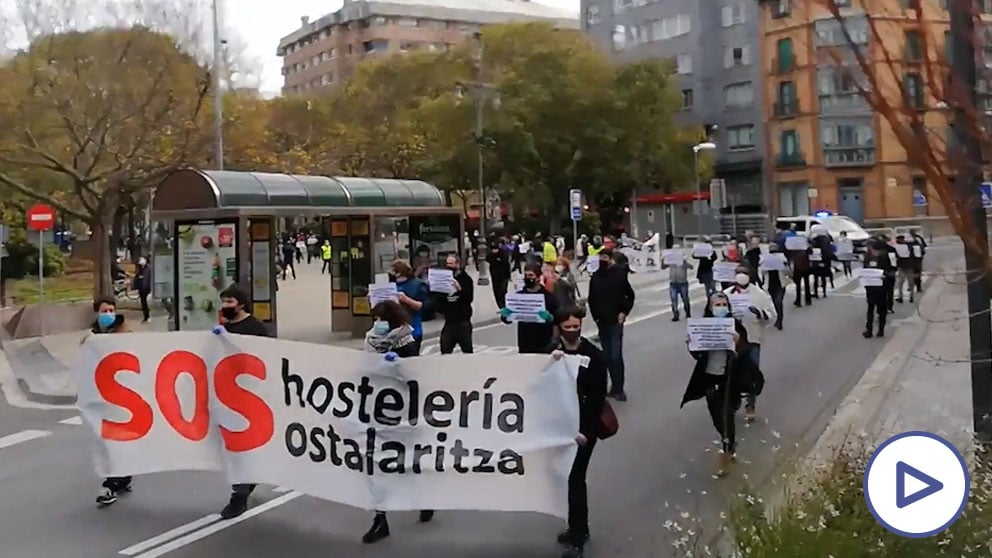 Los manifestantes, que han marchado en tres columnas para respetar la distancia de seguridad, han hecho el recorrido haciendo sonar silbatos y coreando consignas como ‘La hostelería no es la culpable’. Portaban carteles en los que se leían reivindicaciones como la paralización del pago de alquileres e hipotecas o el complemento al 100% de los salarios.