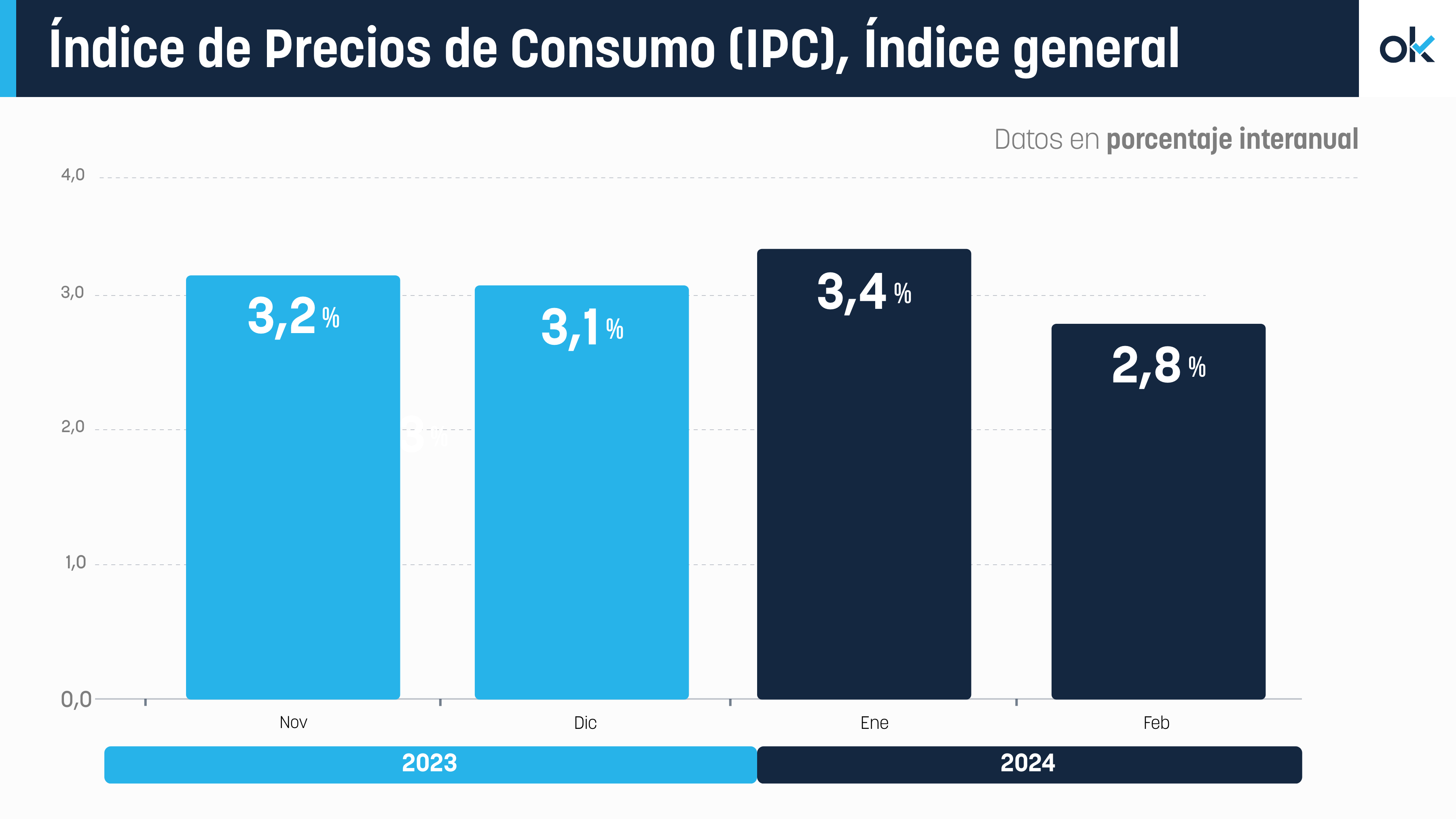 Con el retroceso del IPC interanual en el segundo mes del año, la inflación vuelve a registrar descensos en febrero después del repunte de enero y se sitúa en su nivel más bajo desde el pasado mes de agosto, cuando alcanzó el 2,6%.