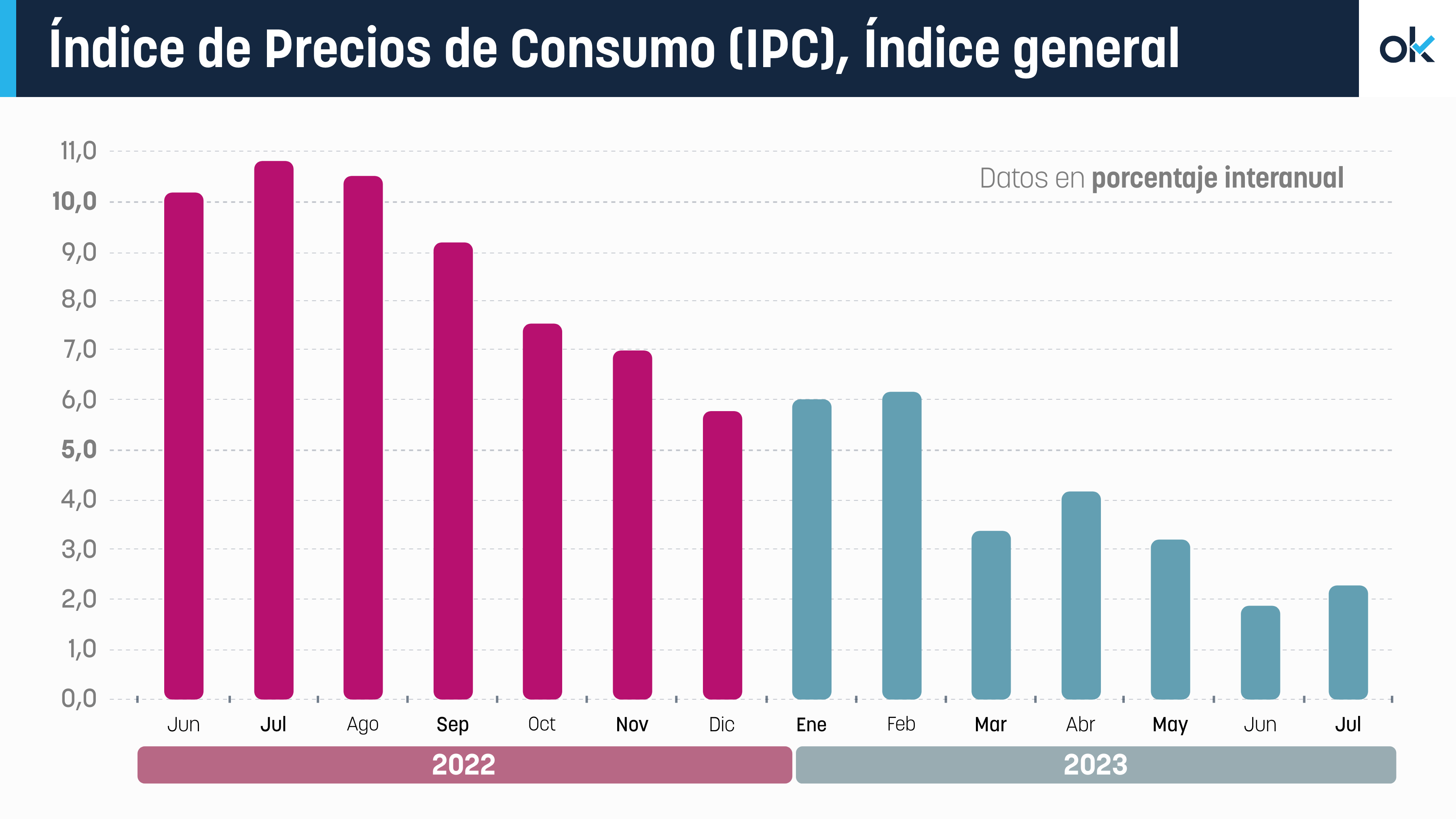 Con este repunte, la inflación deja atrás dos meses consecutivos de moderación, mayo (3,2 %) y junio (1,9 %), aunque se encuentra lejos de las tasas de dos dígitos registradas en el verano de 2022, en parte por el efecto de comparar con un periodo en el que los precios ya estaban subiendo.