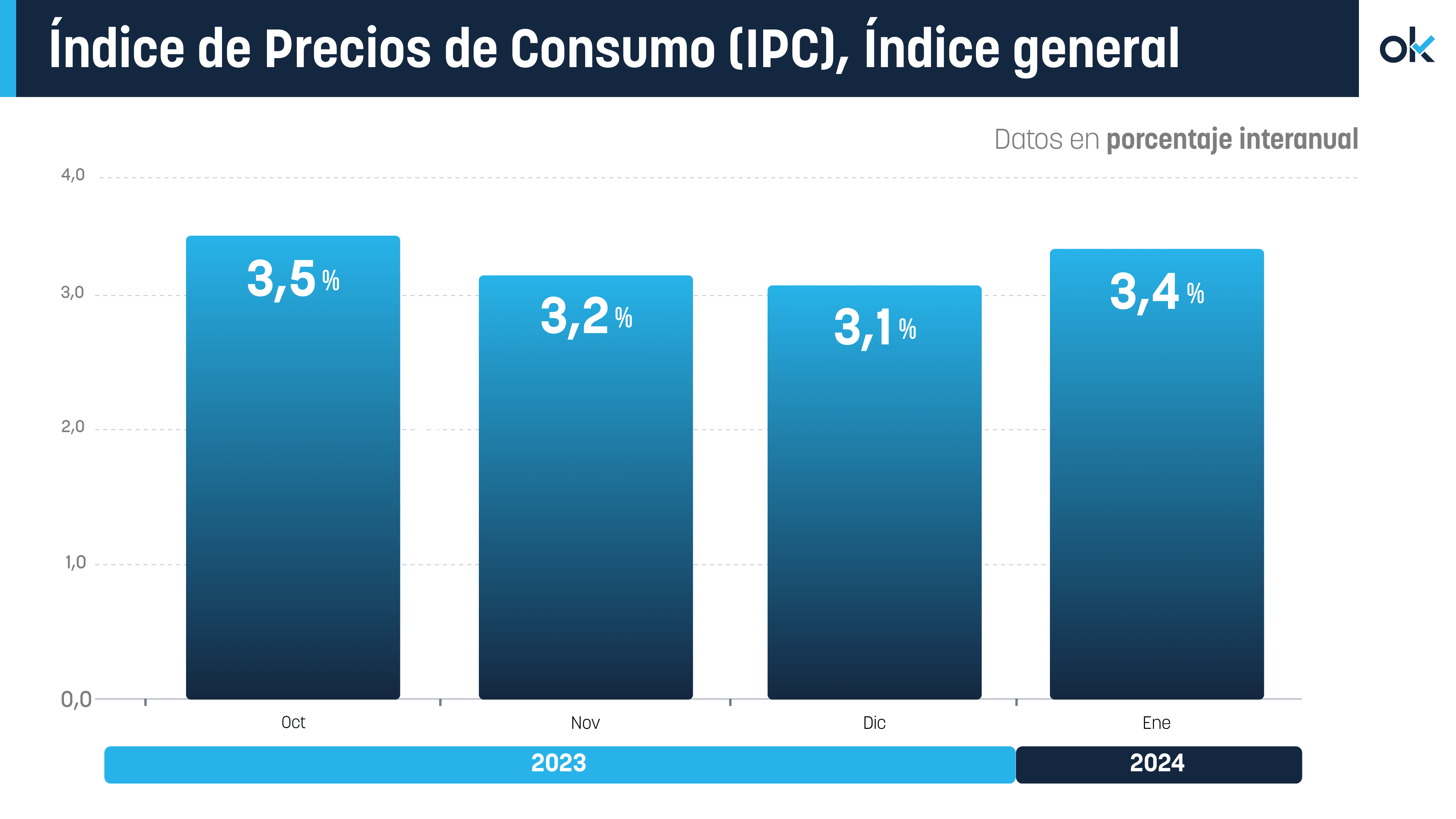 Con el avance del IPC interanual en el arranque del año, la inflación vuelve a registrar ascensos tras dos meses consecutivos de caídas y se sitúa en su nivel más alto desde el pasado mes de octubre, cuando alcanzó el 3,5%.