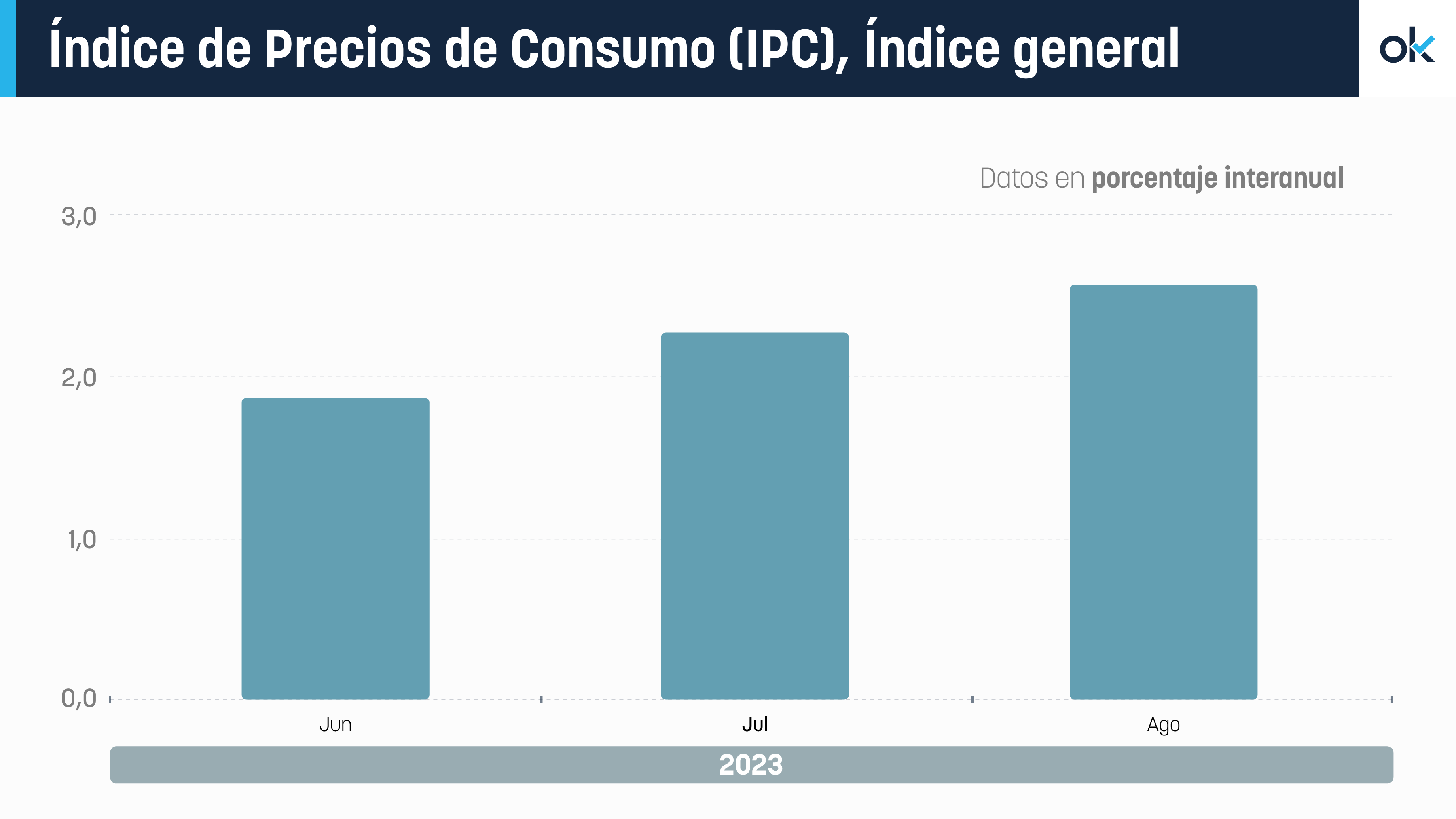 La inflación continúa su senda de crecimiento en agosto con un aumento del 2,6% con respecto al mismo mes del año anterior. La tasa es tres décimas superior al 2,3% de julio. Por tanto, la subida de los precios se da por segundo mes consecutivo, según los datos publicados por el Instituto Nacional de Estadística (INE).