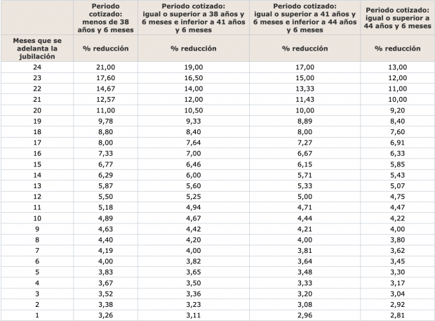 Los coeficientes reductores serán los vigentes en el artículo 208, que hace mención a la «jubilación anticipada por voluntad del interesado». «En los casos de acceso a la jubilación anticipada a que se refiere este artículo, la pensión será objeto de reducción mediante la aplicación, por cada mes o fracción de mes que, en el momento del hecho causante, le falte al trabajador para cumplir la edad legal de jubilación fijada en el artículo 205.1.a), de los coeficientes que resultan del siguiente cuadro en función del período de cotización acreditado y los meses de anticipación», dice el texto sobre los coeficientes reductores que exponemos a continuación.