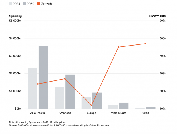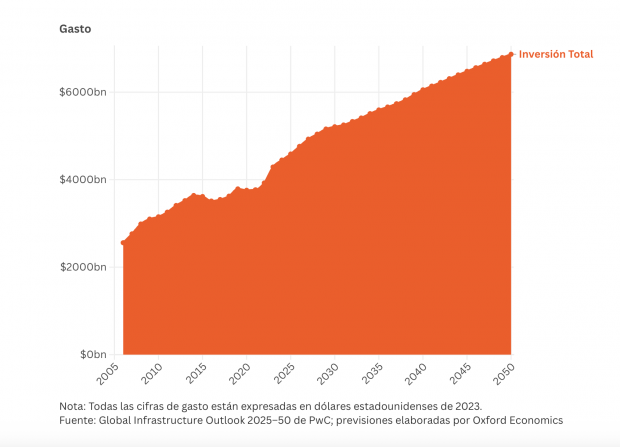 Durante este periodo se estima que la inversión mundial acumulada en infraestructuras alcance los 151,1 billones de dólares, a medida que los países modernicen sus sistemas industriales, de transporte y de energía para responder a los desafíos que plantea la inteligencia artificial, la electrificación y la urbanización. En términos reales, la previsión indica que el gasto mundial en infraestructuras, durante los próximos 25 años, duplicará el registrado en los veinte años anteriores (no existen datos comparables antes de 2006).