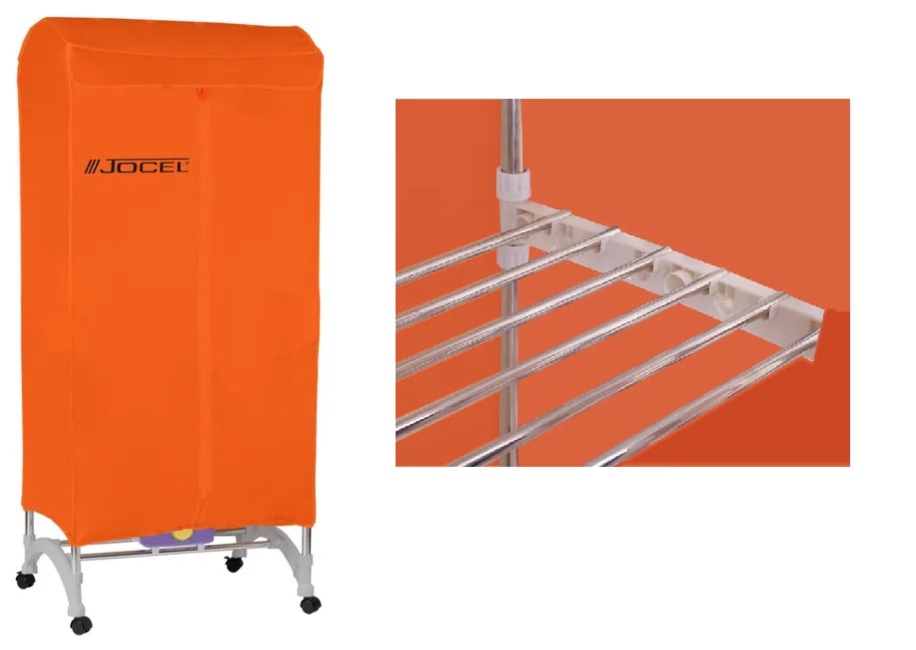 El secador, que se presenta en un acabado de llamativo color naranja, tiene una potencia de 1000 W, soporta un peso máximo de 15 kilos de ropa y las medidas son 70 x 160 x 50 cm (ancho x alto x largo).