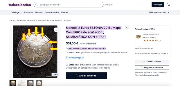 Esta moneda ha subido de valor con el paso de los años por su historia y también se puede encontrar a la venta por 331,50 euros en páginas como Todo Colección por un error de acuñación en la moneda. En eBay se piden 5.999 euros por esta moneda de 2 euros con un error de acuñación. No será para tanto, pero lo cierto es que esta pieza de coleccionista se ha hecho viral por su historia y por sufrir un pequeño error de acuñación en su día en Finlandia.