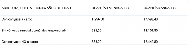 El Gobierno también ha fijado las pensiones mínimas establecidas para la pensión por incapacidad permanente en 2026. En los casos de la pensión por incapacidad permanente absoluta o total con 65 años de edad, está fijada en 17.592,40 euros anuales, que son 1.256,30 euros mensuales, para los beneficiarios con cónyuge a cargo. Los pensionistas sin cónyuge tendrán garantizado un mínimo de 13.106,80 euros mensuales.