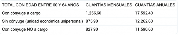La pensión mínima de incapacidad permanente total para los beneficiarios de una edad de entre 60 y 64 años también será de 17.592,40 euros anuales en casos con cónyuge a cargo. Sin cónyuge bajará hasta los 12.262,60 euros y con cónyuge no a cargo será de 11.590,60 euros.