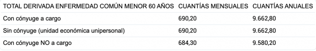 En caso de que la incapacidad total sea derivada de enfermedad común y el beneficiario sea menor de 60 años, la pensión mínima de incapacidad permanente será de 9.662,80 euros, que equivale a 690,20 euros al mes.