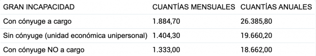 Las pensiones mínimas aumentan en caso de que el beneficiario tenga una gran incapacidad, que ocurre cuando necesita de otra persona para desarrollarse en su día a día. En este caso, la pensión con cónyuge a cargo asciende hasta los 26.385,80 euros, que equivale a 1.884,70 euros al mes. La pensión mínima sin cónyuge será de 1.404,30 euros mensuales y la de los que tengan cónyuge no a cargo será de 1.333,00 euros.