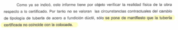 Se trata de la instalación de una tubería en la obra que, según las conclusiones del informe, «se pone de manifiesto que la tubería certificada no coincide con la colocada». El valor de esta partida es de más de ocho millones de euros. En el sumario del caso Acuamed, que fue utilizado por el PSOE para castigar al PP de Mariano Rajoy por la corrupción, hay imputados por cuantías menores.