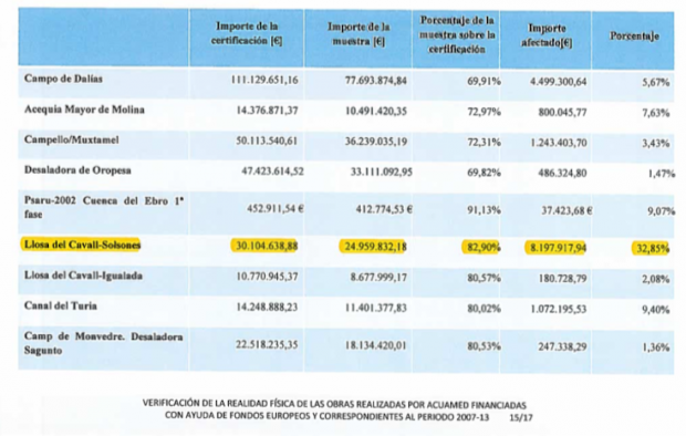 En otro tramo de la obra de la Llosa del Cavall, el informe cifra en 3,2 millones de euros el importe de las partidas «no conformes». En otros casos, la cantidad de dinero cobrada a Acuamed sobre la que discrepan los peritos es menor. En total, el informe -que analiza 13 obras y consta de 68 páginas- pone en duda 18 millones de euros, el 7% del total del coste. La más importante es la de la obra adjudicada por Ballesteros.