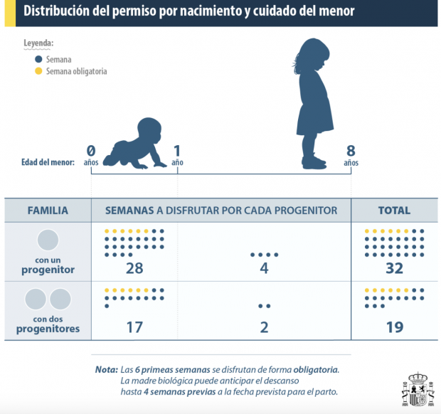 De esta forma, tras la entrada en vigor de la última modificación aprobada en el Congreso, el permiso por nacimiento y cuidado del menor se distribuirá de la siguiente manera en el caso de una familia con dos progenitores con 19 semanas para la madre y el padre: