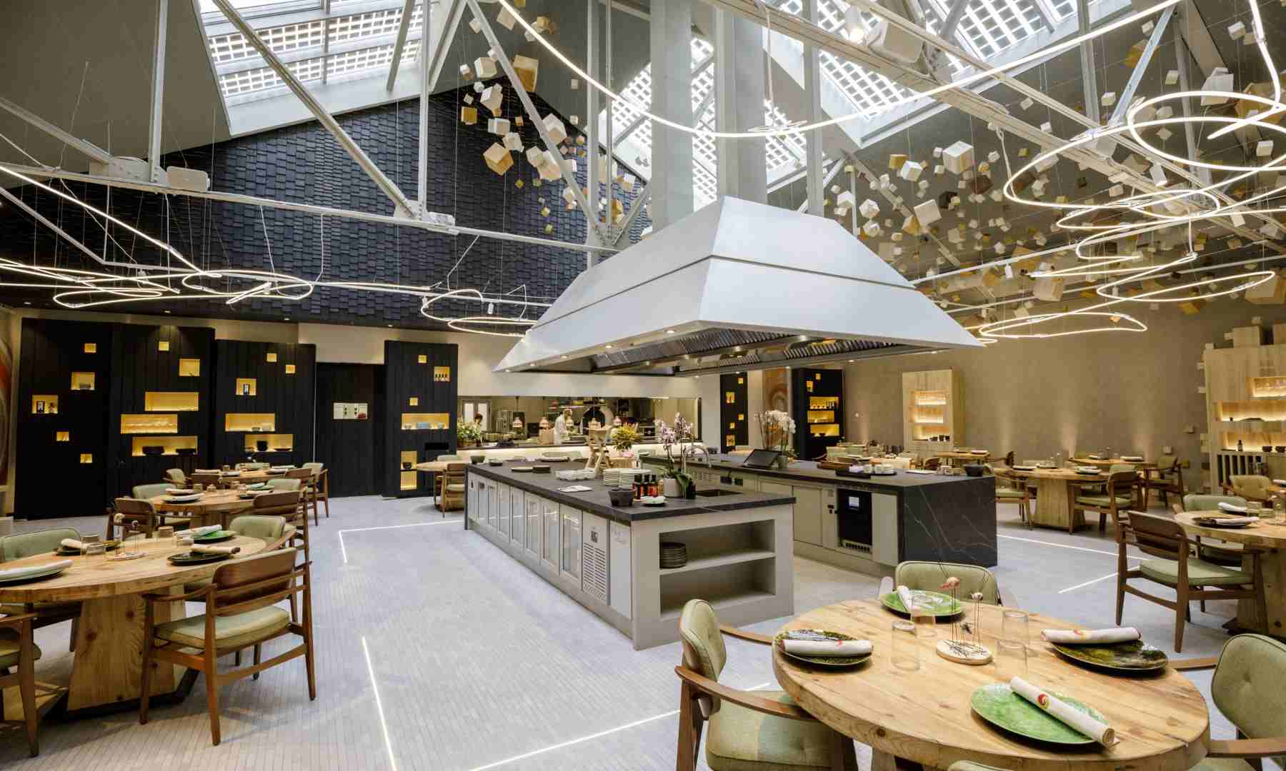 Se trata de una perfecta combinación de formas cambiantes. A través de una cortina de eslabones de aluminio dibujada con un gran remolino se accede al restaurante. Una nave de origen industrial de principios del siglo XX de gran altura de techos donde la cocina se sitúa en un espacio privilegiado para que todas y cada una de las mesas graviten alrededor de este gran núcleo central.