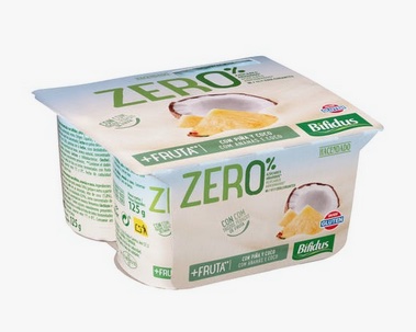- Piña y coco (con pedacitos de fruta) – Los ingredientes son: leche, piña (18%), leche de coco (1,8%), zumo concetrado de limón, aroma natural, concentrado de zanahoria, fermentos lácteos y bifidobacterias.