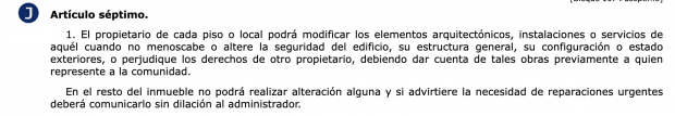 Los casos relativos a las obras en casa y la relación con los vecinos están reflejados en la Ley de Propiedad Horizontal de la forma siguiente: «El propietario de cada piso o local podrá modificar los elementos arquitectónicos, instalaciones o servicios de aquel cuando no menoscabe o altere la seguridad del edificio, su estructura general, su configuración o estado exteriores, o perjudique los derechos de otro propietario, debiendo dar cuenta de tales obras previamente a quien represente a la comunidad».