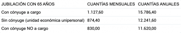 - Pensión mínima (con cónyuge a cargo): 1.127 euros/mes en 2025 – 1.158 euros/mes en 2026.