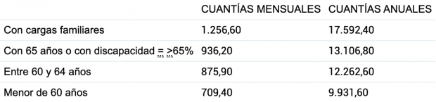 Esto ha dejado la pensión de viudedad con cargas familiares en 1.256,60 euros mensuales, siendo 17.592,50 euros anuales. En el caso de los beneficiarios de una pensión de viudedad con 65 años o una discapacidad, la pensión mínima es de 936,20 euros, que son 13.106,80 euros al año. La pensión mínima de viudedad para los beneficiarios que tengan entre 60 y 64 años es de 875,90 euros y para los menores de 60 años la mínima es de 709,40 euros, que son 9.931,60 euros anuales.