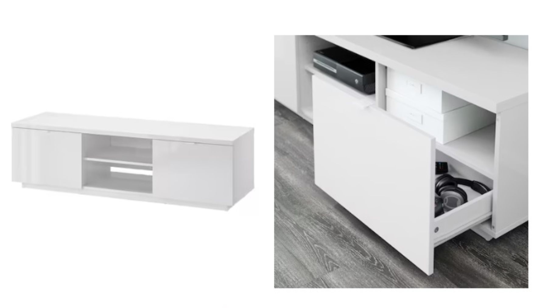Un mueble de color blanco brillante, ideal para que te combine con cualquier estilo que tengas en tu salón en el que según Ikea puedes acomodar un televisor de hasta 63″o soportar un peso de hasta 50 kilos. También cuenta con cajones, por lo que otros elementos como por ejemplo la videoconsola y sus juegos, o el decodificador de la plataforma a la que estés abonado, no tienen porque estar expuestos de manera incómoda en todo momento.