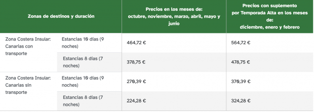 Los viajes del IMSERSO 2025 en Canarias también cotizan al alza y la estancia de 10 días (9 noches) con transporte tiene un precio de 464,72 euros en temporada baja (octubre, noviembre, marzo, abril, mayo y junio). Durante los meses de diciembre, enero y febrero, el precio sube hasta los 564,72 euros.