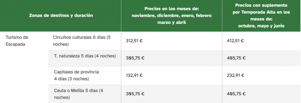 El IMSERSO 2025 también incluye la opción de turismo de escapada, en el que se incluyen circuitos culturales de 6 días por 312,51 euros, turismo de naturaleza por 305,75 euros, cuatro días en capitales de provincia por un módico precio de 132,91 euros y cinco días en Ceuta o Melilla por 305,75 euros, siempre en temporada baja.
