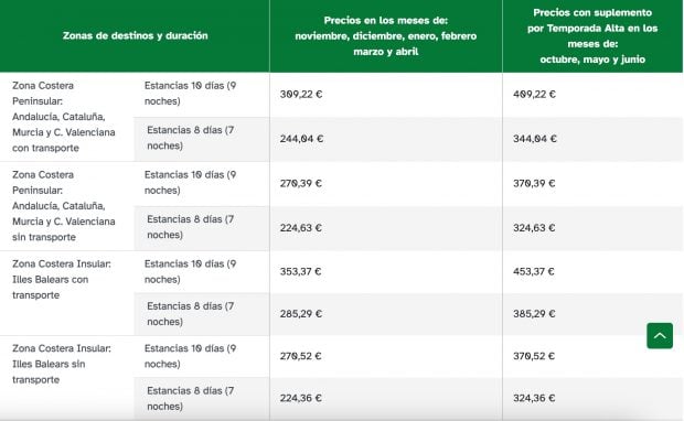 Los destinos y precios del IMSERSO 2025 serán similares a los de anteriores temporadas. Por ejemplo, la estancia de 10 días (9 noches) en la zona costera peninsular que incluye destinos como Andalucía, Cataluña, Comunidad Valenciana y Murcia, tiene un coste de 309,22 euros durante los meses de noviembre, diciembre, enero, febrero, marzo y abril. En temporada alta, en los meses de octubre, mayo y junio, el coste con transporte asciende a 409,22 por persona.