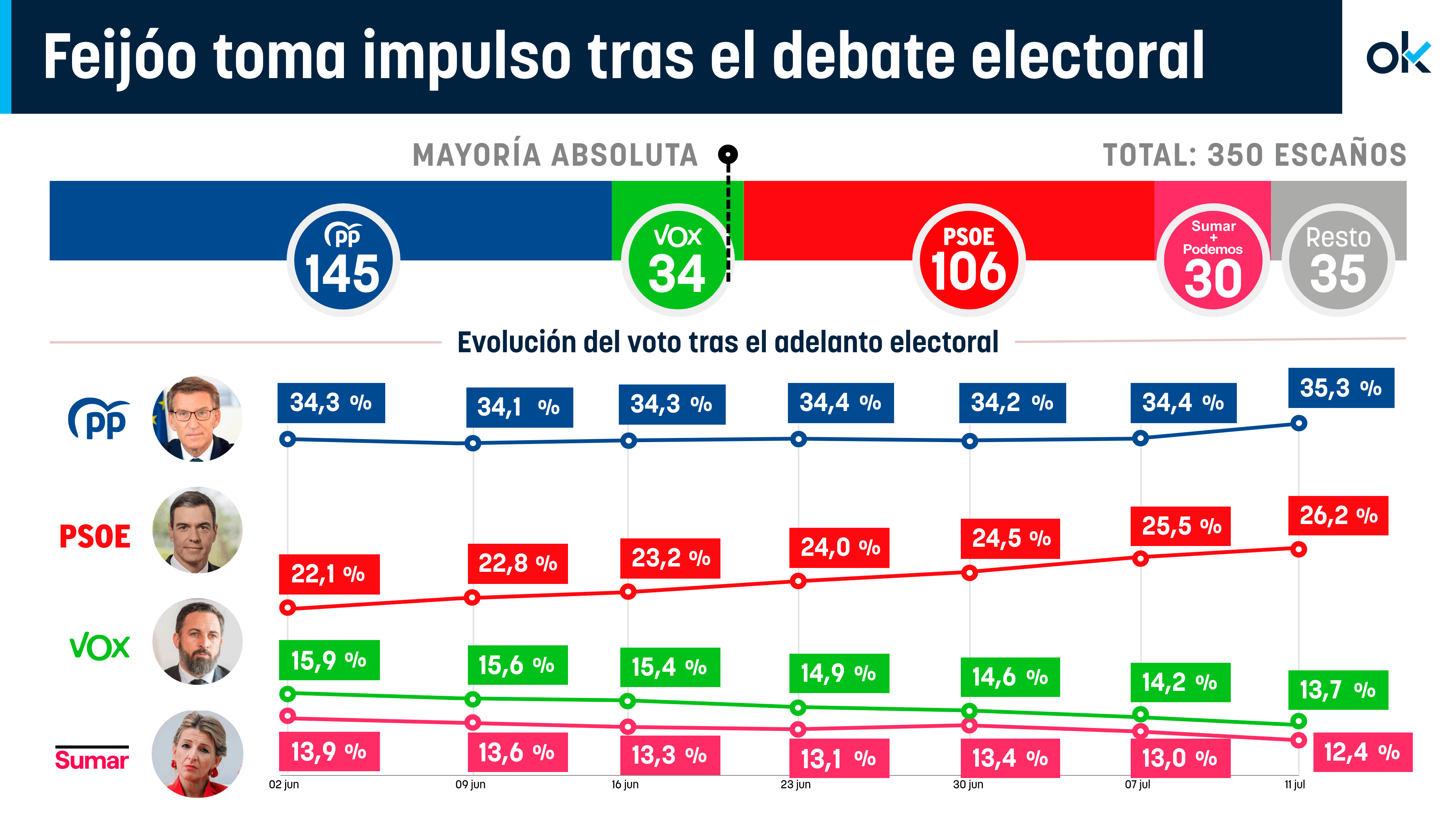 El arranque de la campaña electoral y, sobre todo, el debate del que salió vencedor impulsan las expectativas de Alberto Núñez Feijóo. El PP sube casi un punto en los últimos cuatro días, hasta el 35,3% de los votos, se dirige hacia los 150 escaños y aumentaría el margen de la mayoría absoluta junto a Vox: 179 escaños para la derecha, tres por encima del listón que marca el preciado trofeo. PP y Vox concentran un respaldo electoral del 49% de los votos, frente al 38,6% que alcanzan juntos el PSOE y Sumar, según la encuesta de intención de voto que Data10 elabora para OKDIARIO de cara a las elecciones del 23J.