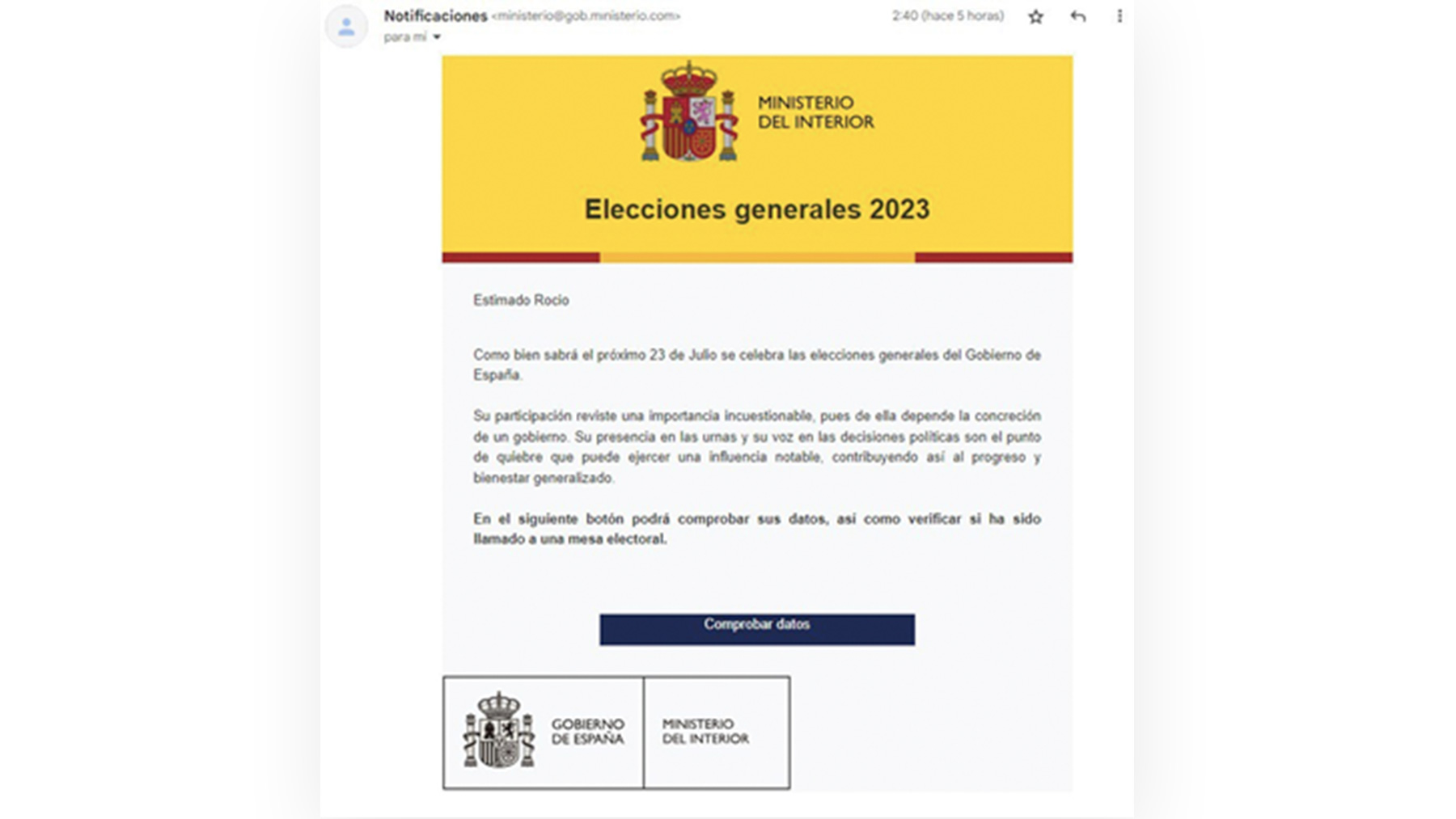 Desde el Ministerio del Interior ya han alertado de que este mensaje forma parte de una nueva campaña de pishing para proceder al robo de datos utilizando como cebo las elecciones generales.
