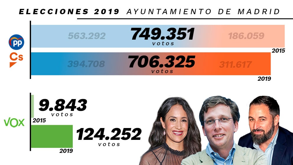 Las candidaturas del PP y Ciudadanos al Ayuntamiento de Madrid sumaron el domingo 43.000 votos menos que hace cuatro años. Sin embargo, José Luis Martínez Almeida o Begoña Villacís tienen todo a favor para ser el próximo alcalde de la capital de España en sustitución de Manuela Carmena. ¿Cómo es posible esta paradoja? La respuesta está en el voto que movilizó Vox, que pasó de los 9.843 que obtuvo en 2015 a los más de 124.000 que logró cuatro años después.