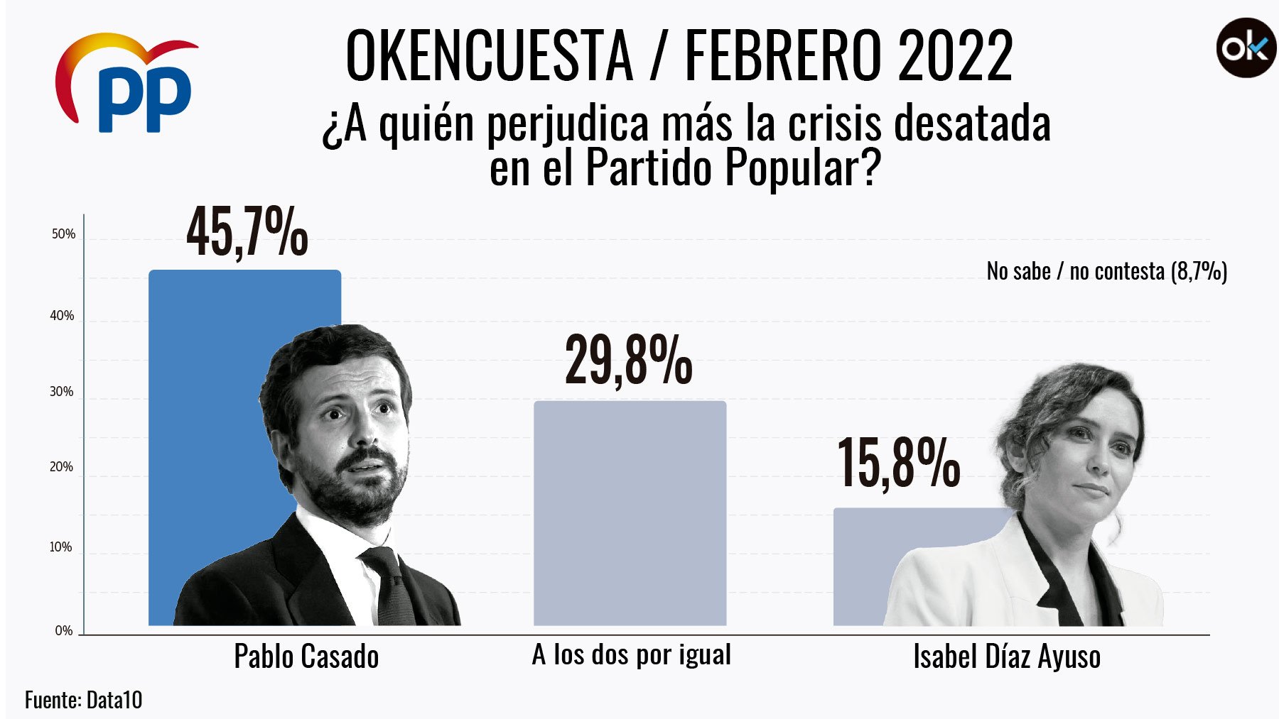 Pablo Casado es el más perjudicado por la crisis abierta en el Partido Popular, según sus propios votantes. Así se desprende de la encuesta de Data10 para OKDIARIO, que recoge la opinión de los electores sobre la tormenta política que ha sacudido al principal partido de la oposición.
