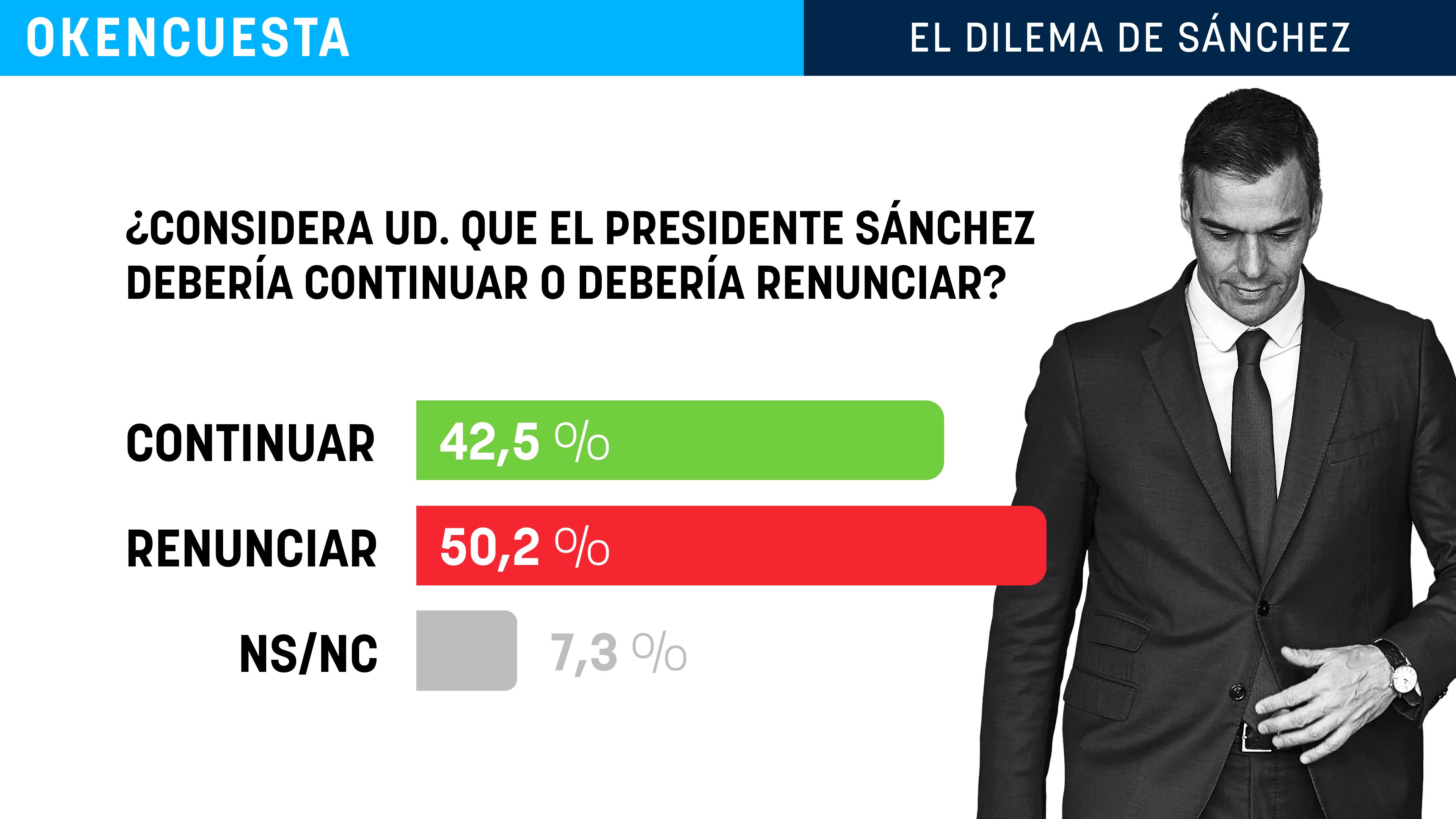 La mayoría de españoles cree que el presidente del Gobierno debería comunicar el lunes su renuncia tras expirar el plazo de cinco días que se ha dado para decidir si se mantiene o no como jefe del Ejecutivo. Un 50,2% considera que Pedro Sánchez debe anunciar su marcha, frente al 42,5% que apuesta por que continúe en La Moncloa, según las conclusiones de la encuesta de Data10 para OKDIARIO, que mide el pulso sobre el asunto que ha agitado la actualidad política. Hay además un 7,3% que no sabe o no contesta.