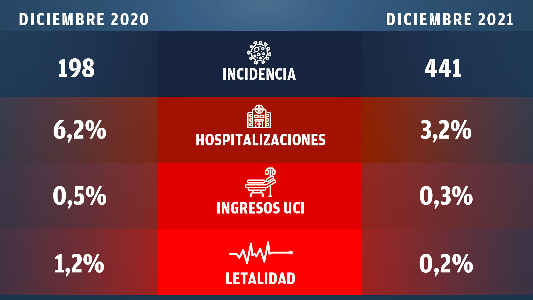 Llegan las fiestas de Navidad y con ellas, de nuevo, el miedo a los contagios sociales en cenas y eventos. Con España alcanzando este jueves los 441 casos por cada 100.000 habitantes de incidencia, los datos pueden resultar alarmantes: son más del doble de los 198 casos que había justo hace un año. Sin embargo, los datos oficiales del Instituto Carlos III (ISCIII) relativizan la alerta: las hospitalizaciones y la tasa de ingreso en UCI han caído a la mitad, mientras la letalidad se ha desplomado hasta seis veces la que había hace 365 días.