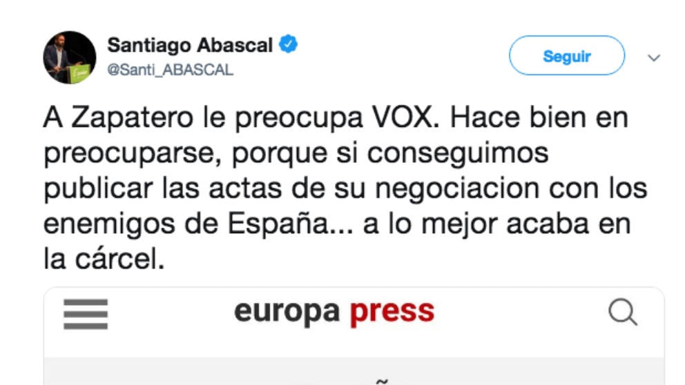 A Zapatero le preocupa VOX. Hace bien en preocuparse, porque si conseguimos publicar las actas de su negociacion con los enemigos de España… a lo mejor acaba en la cárcel. pic.twitter.com/Wb8YpLjsdW
