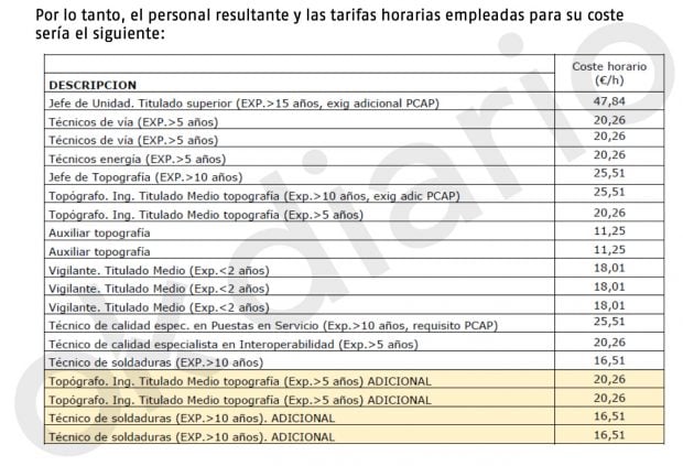 Sin embargo, Ayesa presentó un presupuesto por debajo de lo estimado, que mereció la calificación de «baja temeraria», esto es, con «valores anormales o desproporcionados». Adif requirió una justificación y la empresa respondió con un informe detallado, al que ha tenido acceso OKDIARIO, en el que justificaba su propuesta, con un detallado desglose de gastos de personal, logística y transporte. El coste de cada técnico de soldaduras era de 16,51 euros por hora. Vista la documentación, Adif concluyó que «la viabilidad» de la oferta quedaba «demostrada».