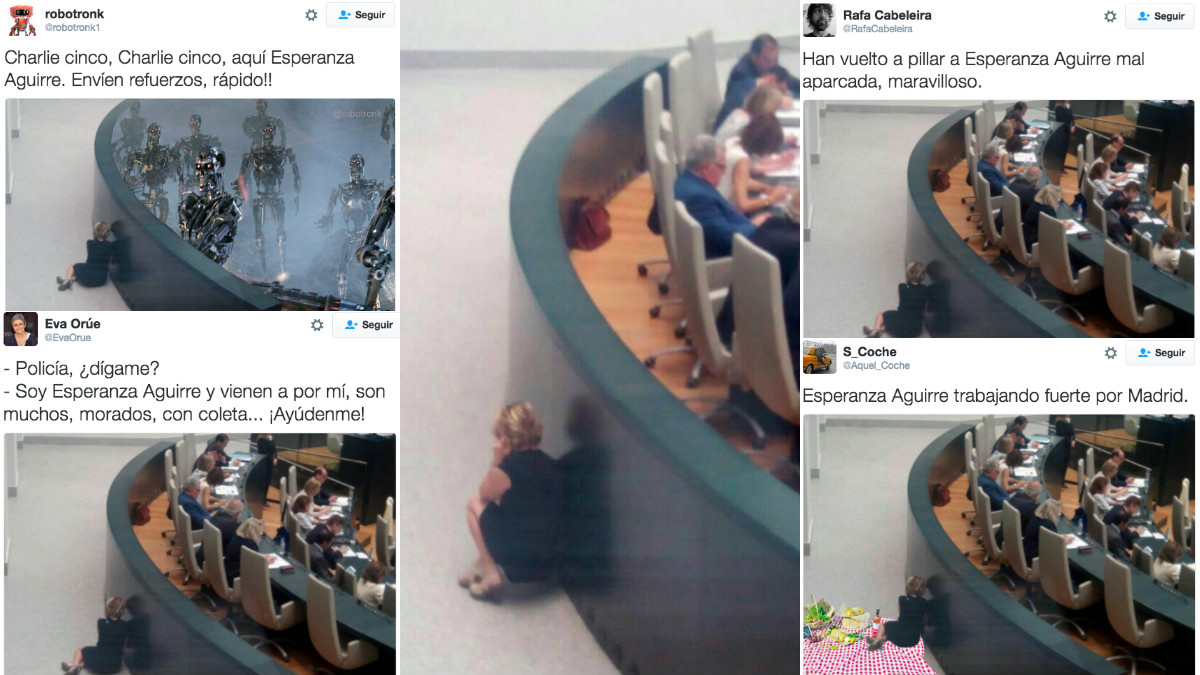 La líder de la oposición en la capital, Esperanza Aguirre, ha sido este martes el objetivo de los memes de las redes sociales. Un un momento del Pleno del Ayuntamiento de Madrid se ha retirado unos minutos para atender una llamada de EsRadio del programa de Federico Jiménez Losantos. La ausencia de locutorios en el Pleno del Ayuntamiento –habituales en otros hemiciclos– es una problemática que se pone de manifiesto de esta manera.