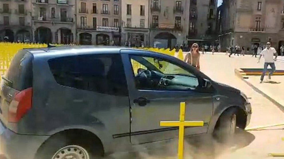 Los hechos ocurriron el domingo por la mañana en una plaza, la principal de Vic: allí, los separatistas habían dispuesto centenares de cruces amarillas por todas las plazas en apoyo de los golpistas encarcelados. Un conductor apareció en la plaza arrollando varias de estas cruces, protagonizando un llamativo episodio que ha tenido un gran recorrido por las redes sociales a lo largo del día.