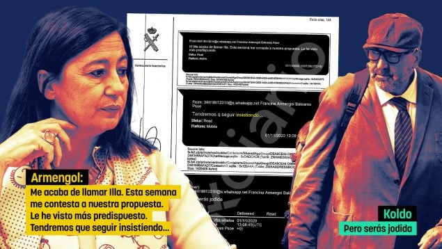 El documento recoge una conversación de WhatsApp del 1 de noviembre de 2020 en la que Armengol escribe a Koldo: «¡Hola! Me acaba de llamar Illa. Esta semana me contesta a nuestra propuesta. Le he visto más predispuesto». Y añade: «Tendremos que seguir insistiendo». Koldo responde con una sola frase con orgullo: «Pero serás jodida».