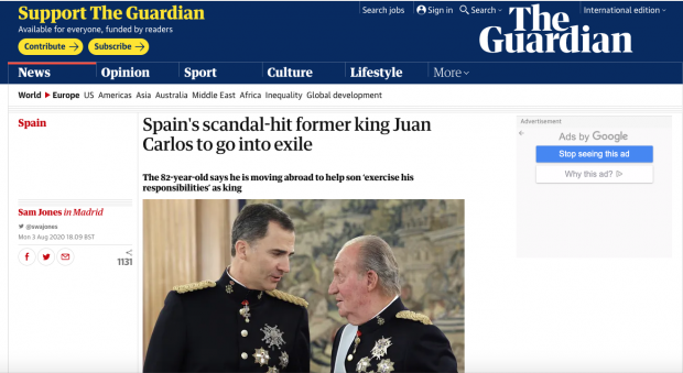 El diario The Guardian ha recogido en una pieza el «escándalo español» por el que el Rey Juan Carlos I ha tomado la decisión de «exiliarse». «El hombre de 82 años dice que se mudará al extranjero para ayudar a su hijo a «ejercer sus responsabilidades’ como Rey», señala el medio británico en un subtitular. «Juan Carlos abandona el país y se exilia en el extranjero después de una serie de acusaciones perjudiciales sobre sus arreglos financieros que han dañado la reputación de la monarquía y avergonzado a su hijo, el Rey Felipe», añade en su pieza.