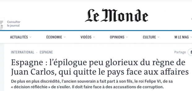 En nuestro país vecino, Francia, también se han hecho eco de la salida del Rey Emérito de España. El diario Le Monde se refiere a este hecho como un «epílogo sin gloria» de su reinado y que abandona España «para hacer negocios». «Cada vez más desacreditado, el ex soberano le contó a su hijo, el Rey Felipe VI, su ‘decisión considerada’ de exiliarse. Se enfrenta a cargos de corrupción», añade el medio galo.