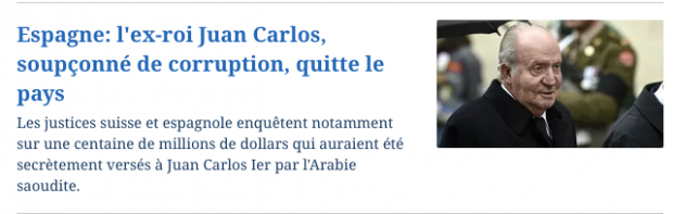 Le Figaro informa de que Juan Carlos es «sospechoso de corrupción» y que «abandona el país». «Los tribunales suizo y español están investigando en particular cien millones de dólares que Arabia Saudita habría pagado secretamente a Juan Carlos I», recoge en su pieza el medio francés.