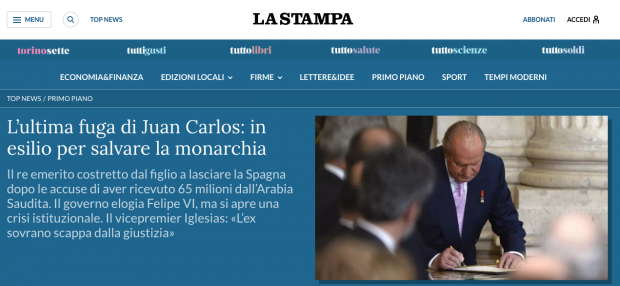 La Stampa lleva como titular «El último escape de Juan Carlos: en el exilio para salvar la monarquía». «El Rey Emérito obligado por su hijo a abandonar España después de ser acusado de recibir 65 millones de Arabia Saudita. El Gobierno elogia a Felipe VI, pero se abre una crisis institucional», recoge en su titular. También destaca la reacción de Pablo Iglesias, vicepresidente segundo del Gobierno de Pedro Sánchez: «Vicepresidente Iglesias: ‘El ex soberano escapa de la justicia’».