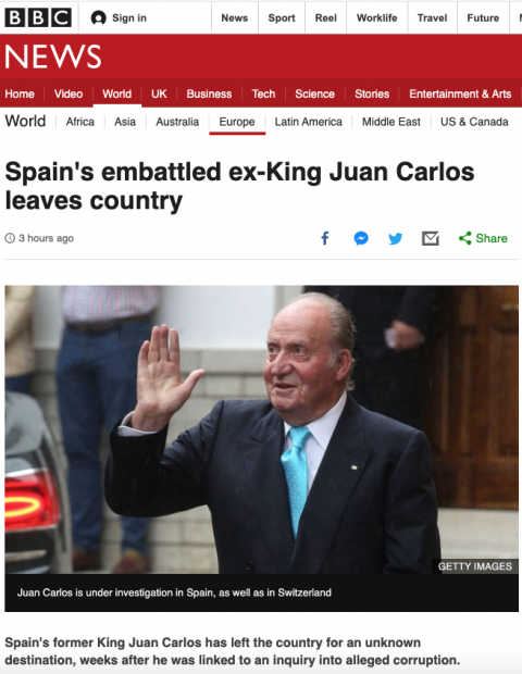 La BBC lleva como titular «el asediado ex Rey Juan Carlos deja el país». «El ex Rey de España, Juan Carlos, abandonó el país en busca de un destino desconocido, semanas después de haber sido vinculado a una investigación sobre presunta corrupción», destaca en su noticia.