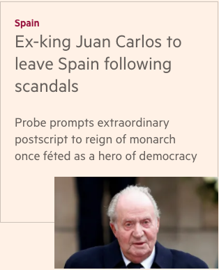 Otro medio británico, en este caso Financial Times, también informa sobre esta noticia. «El ex Rey Juan Carlos dejará España después de varios escándalos», señala en un titular. Dentro de la pieza el diario remarca la trayectoria del padre de Felipe VI durante sus casi 40 años de reinado al describirle como un «héroe de la democracia».